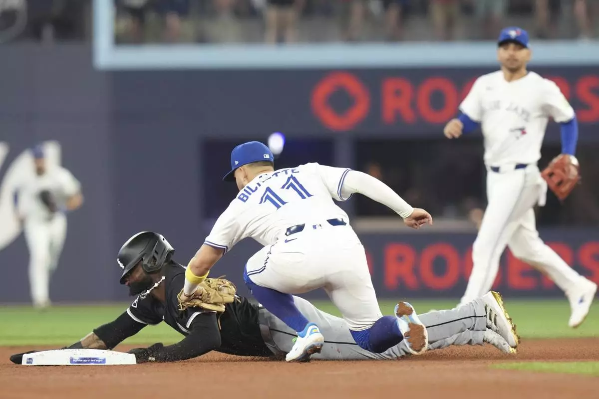 Chicago White Sox outfielder Luis Robert Jr. (88) is tagged out at second base by Toronto Blue Jays shortstop Bo Bichette (11) during the fourth inning of a baseball game in Toronto, Sunday June 22, 2025. (Chris Young/The Canadian Press via AP)
