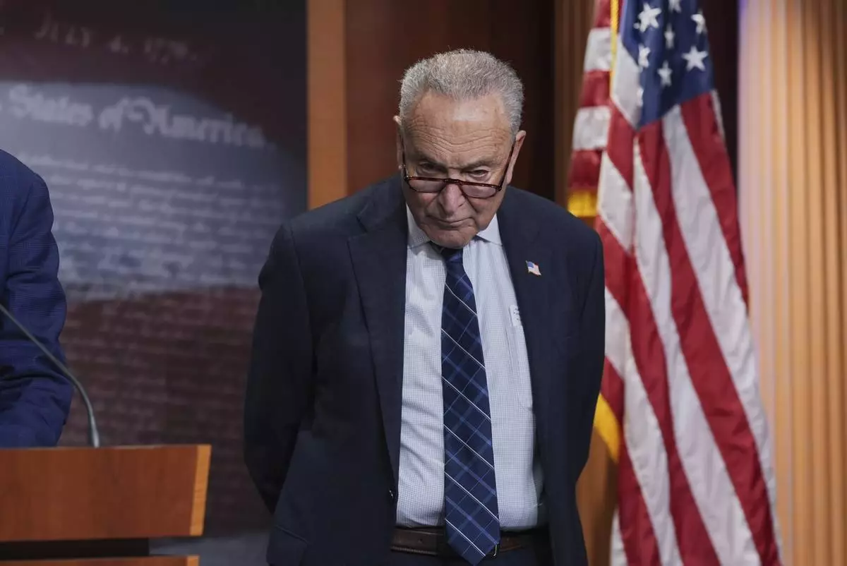 Senate Minority Leader Chuck Schumer, D-N.Y., talks to reporters about Senate Republicans' efforts to pass President Donald Trump's tax cut and spending agenda with deeper Medicaid cuts, at the Capitol in Washington, Wednesday, June 18, 2025. (AP Photo/J. Scott Applewhite)