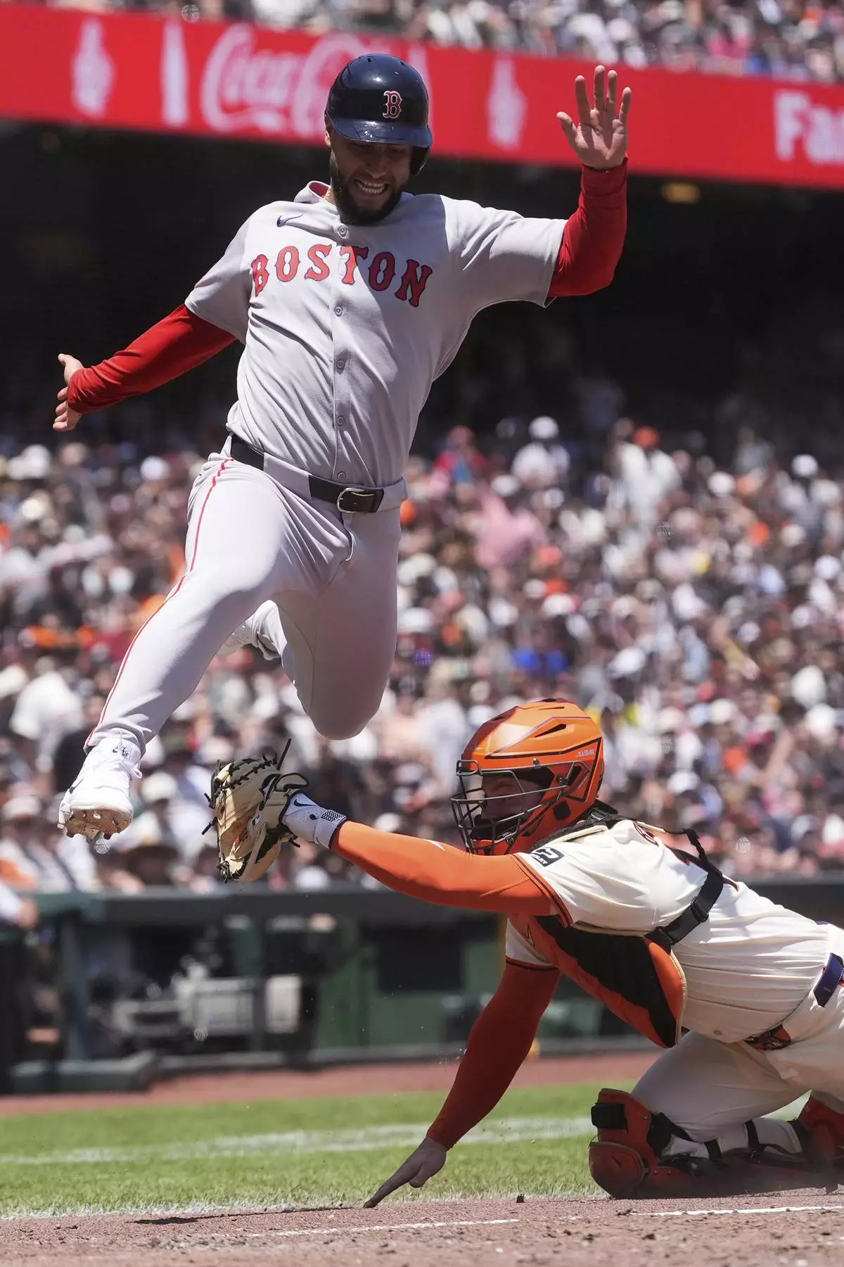 Boston Red Sox's Abraham Toro, left, is called out at home as San Francisco Giants catcher Patrick Bailey reaches for him during the fourth inning of a baseball game in San Francisco, Sunday, June 22, 2025. (AP Photo/Jeff Chiu)