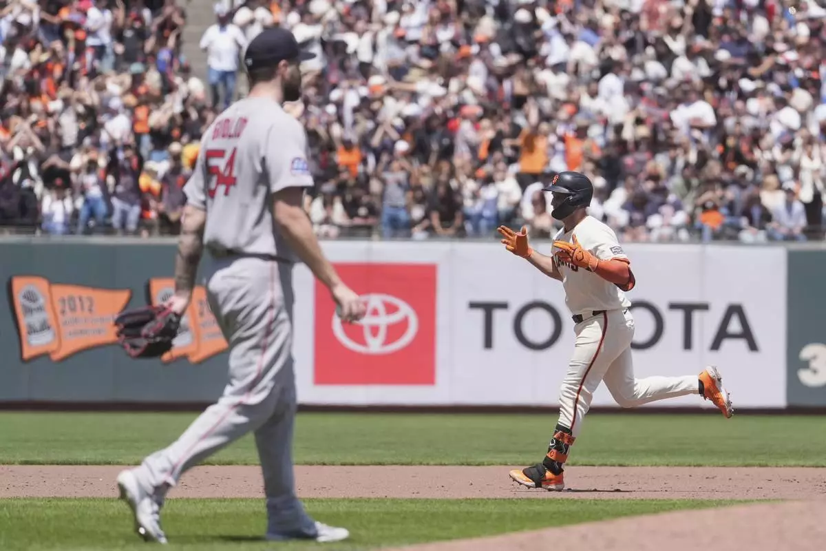 San Francisco Giants' Casey Schmitt, right, gestures after hitting a home run off of Boston Red Sox pitcher Lucas Giolito, left, during the fifth inning of a baseball game in San Francisco, Sunday, June 22, 2025. (AP Photo/Jeff Chiu)