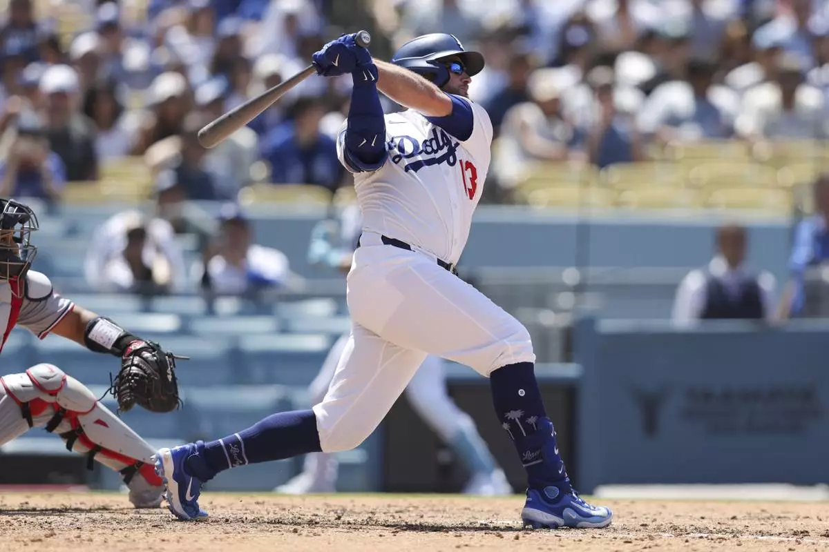 Los Angeles Dodgers' Max Muncy follows through on a grand slam during the sixth inning of a baseball game against the Washington Nationals in Los Angeles, Sunday, June 22, 2025. (AP Photo/Jessie Alcheh)