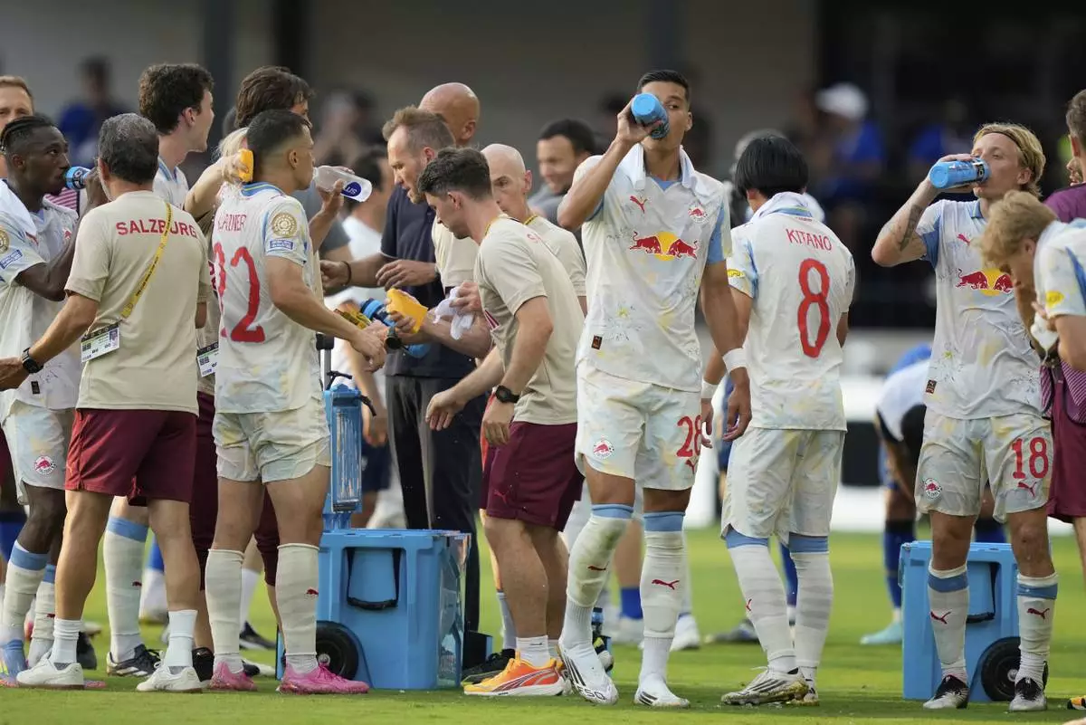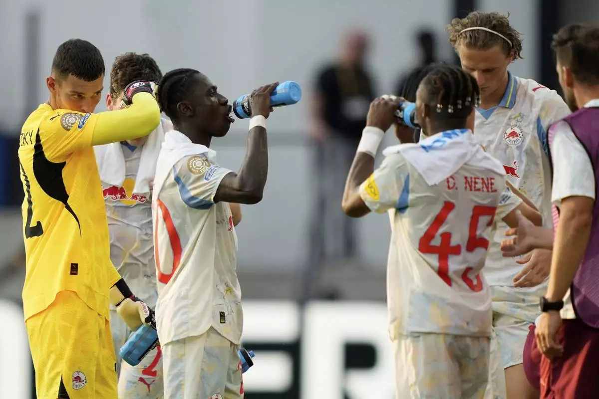 Red Bull Salzburg players take a drinks break during the Club World Cup Group H soccer match between Salzburg and Al Hilal in Washington, Sunday, June 22, 2025. (AP Photo/Julia Demaree Nikhinson)