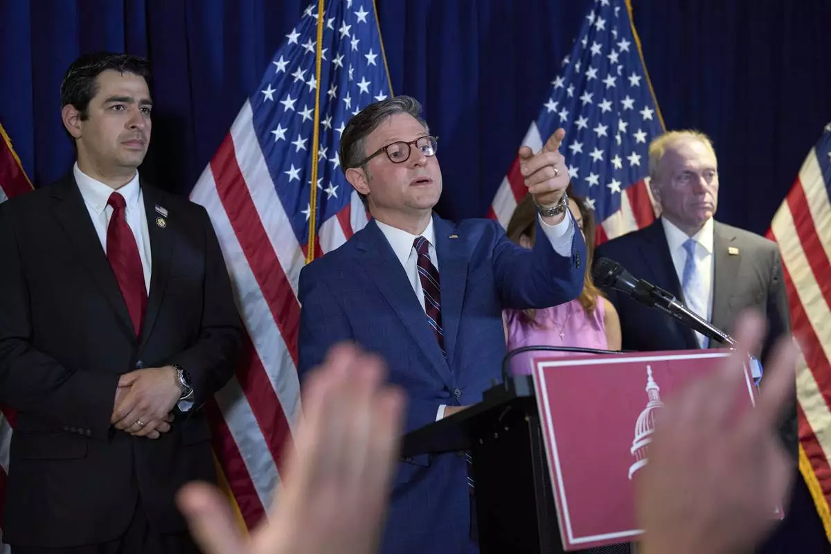 Speaker of the House Mike Johnson, R-La., center, flanked by Rep. Gabe Evans, R-Colo., left, and House Majority Leader Steve Scalise, R-La., defends Donald Trump's handling of protests in Los Angeles and echoed the president's attacks on Democratic Gov. Gavin Newsom as Trump sends thousands of National Guard troops and 700 active duty Marines to quell the protests over raids by Immigration and Customs Enforcement, during a news conference at the RNC near the Capitol in Washington, Tuesday, June 10, 2025. (AP Photo/J. Scott Applewhite)