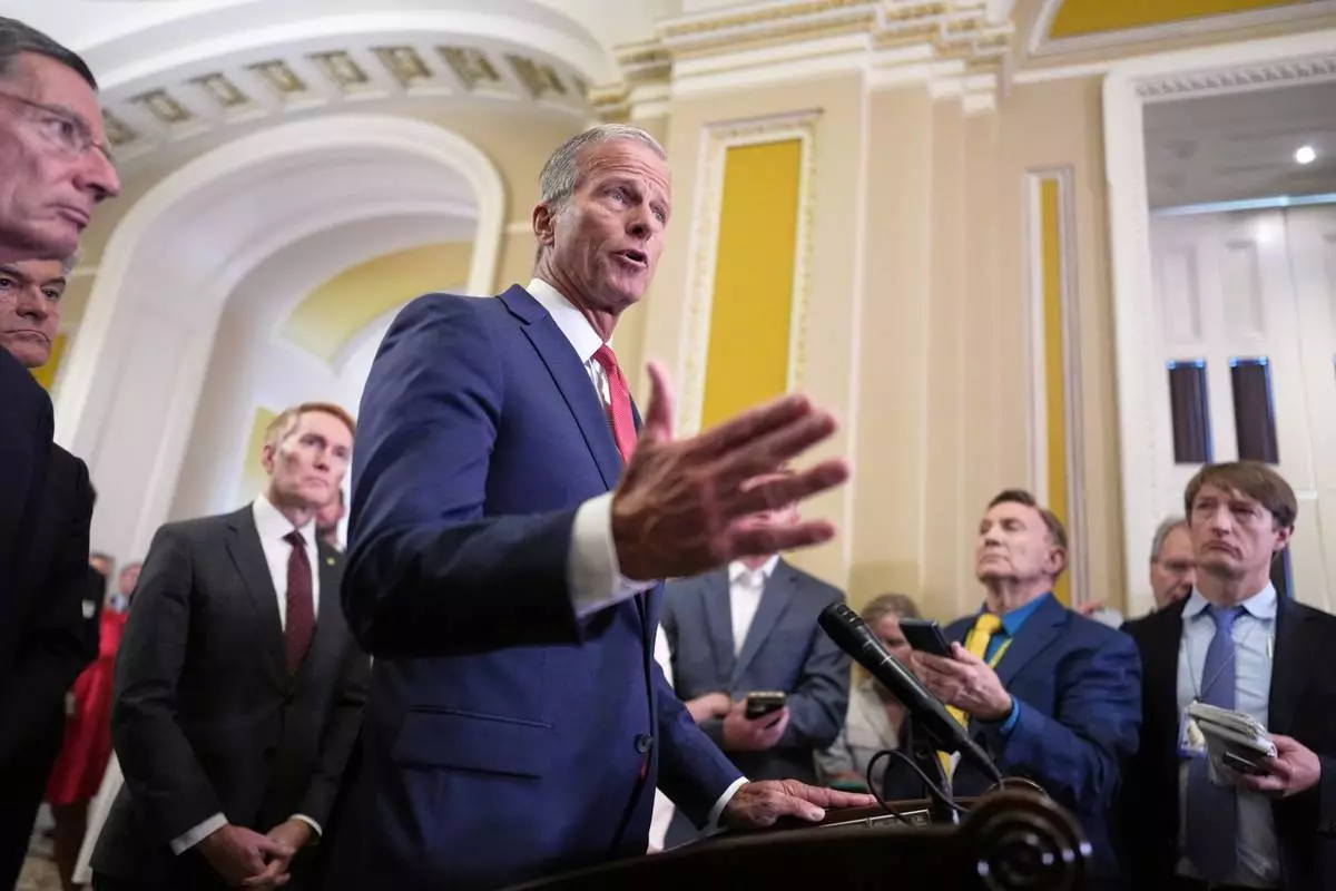 Senate Majority Leader John Thune, R-S.D., speaks to reporters following closed-door party meetings at the Capitol in Washington, Tuesday, June 17, 2025. (AP Photo/J. Scott Applewhite)