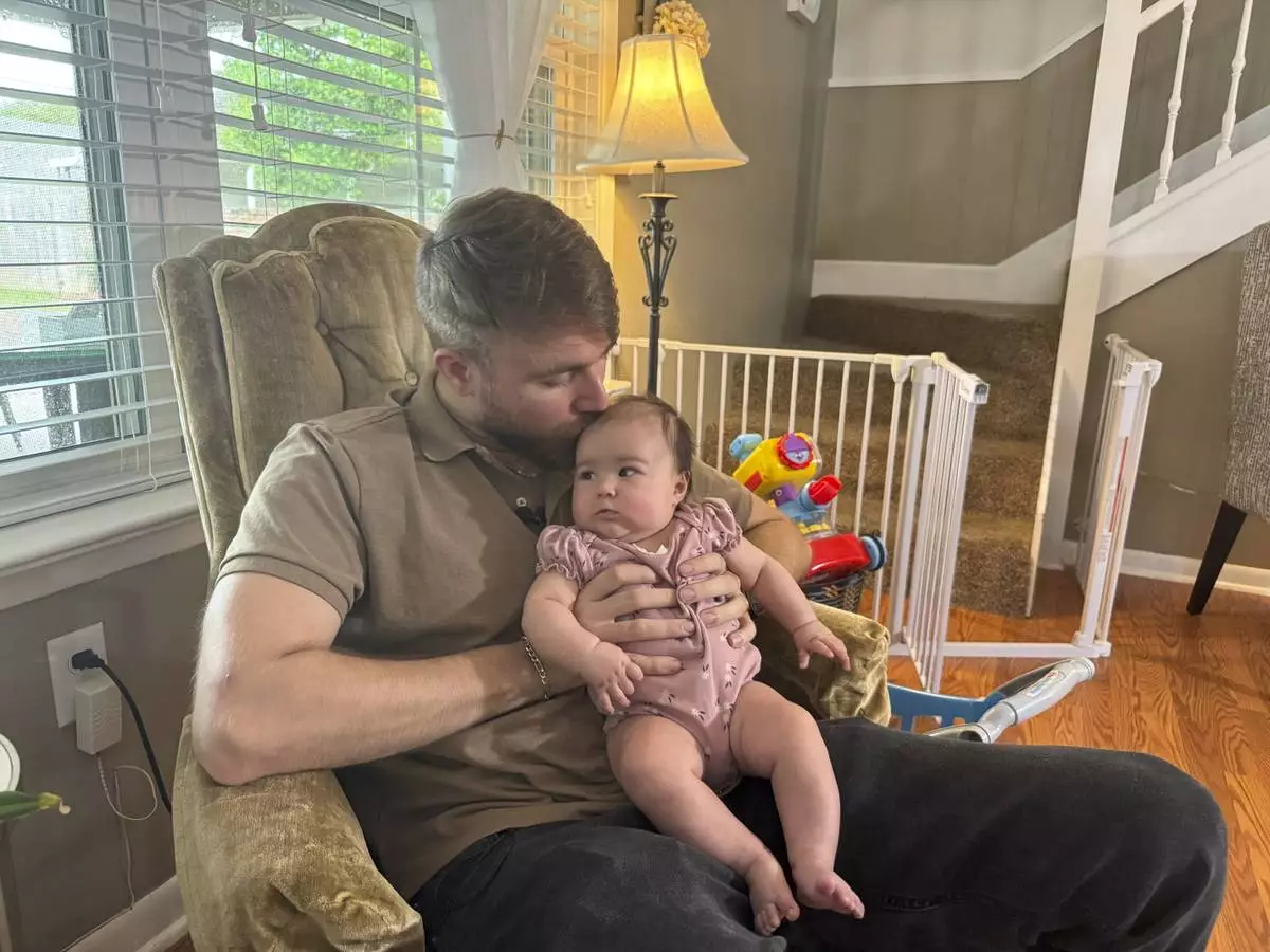 U.S. Marine Corps veteran Adrian Clouatre holds his 3-month-old daughter Lyn at their home in Baton Rouge, La. on Tuesday, June 17, 2025. (AP Photo/Jack Brook)