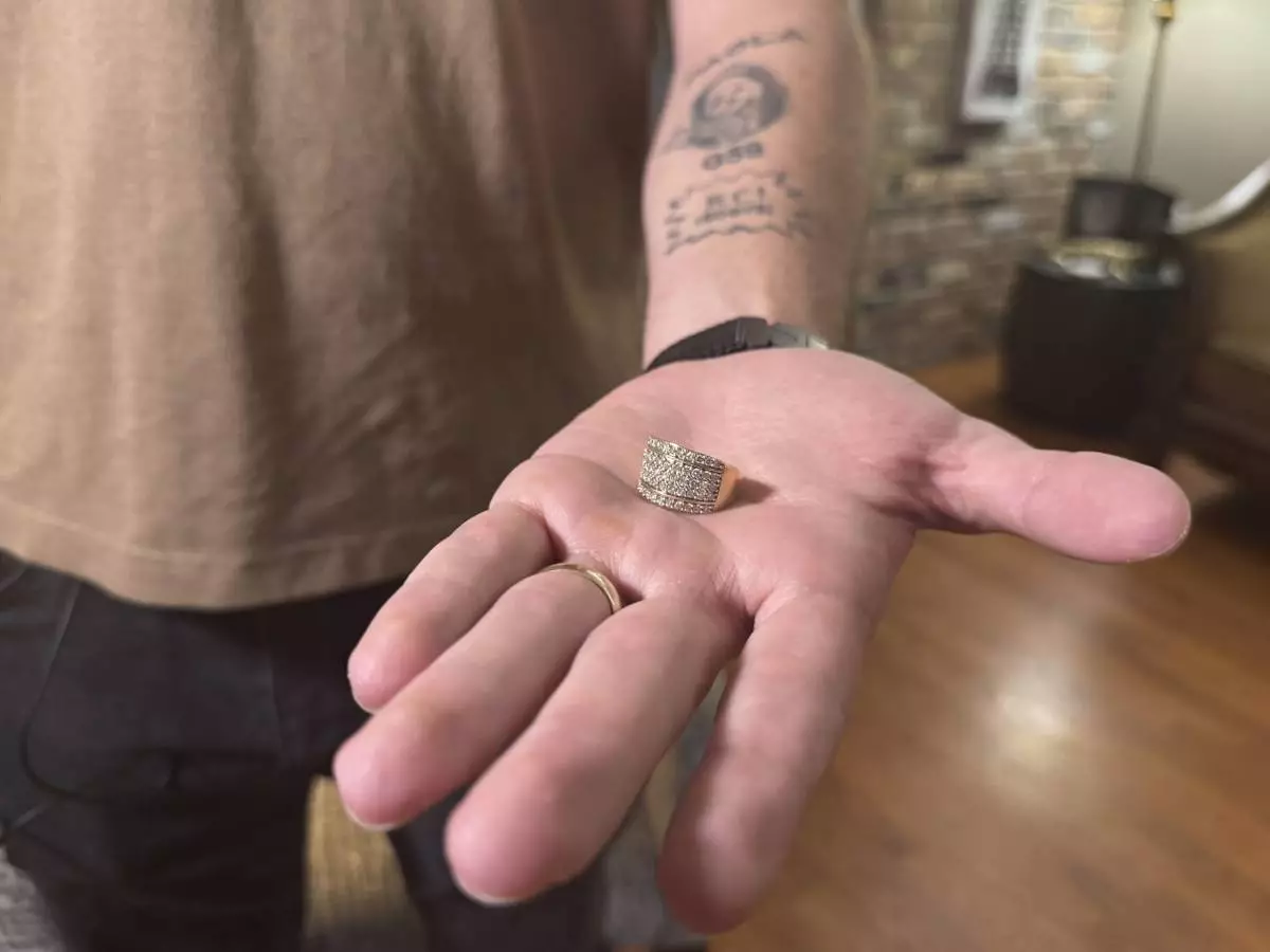 U.S. Marine Corps veteran Adrian Clouatre holds his wife Paola's wedding ring at his house in Baton Rouge, La. on Tuesday, June 17, 2025, which she gave to him after being arrested by ICE officers in May. (AP Photo/Jack Brook)