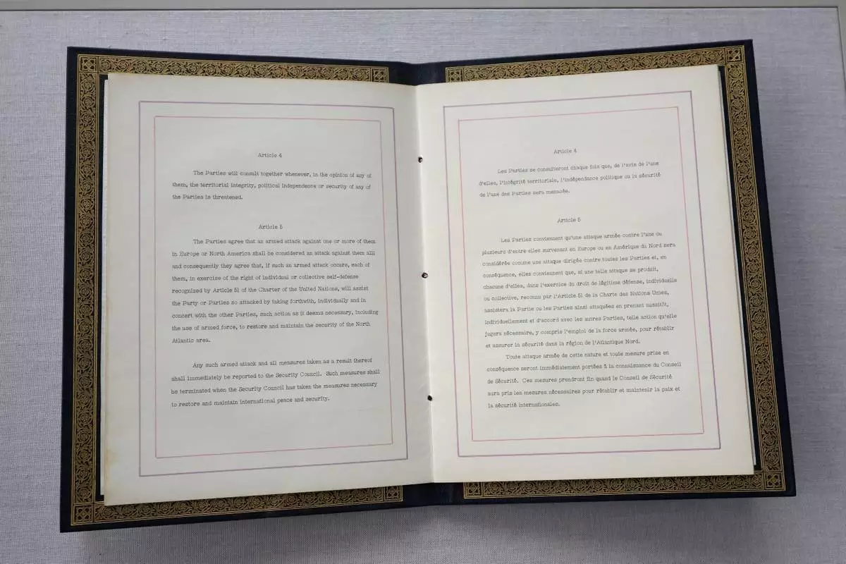 FILE - The Washington Treaty on display during a ceremony to mark the 75th anniversary of NATO at NATO headquarters in Brussels, Thursday, April 4, 2024. (AP Photo/Geert Vanden Wijngaert, File)