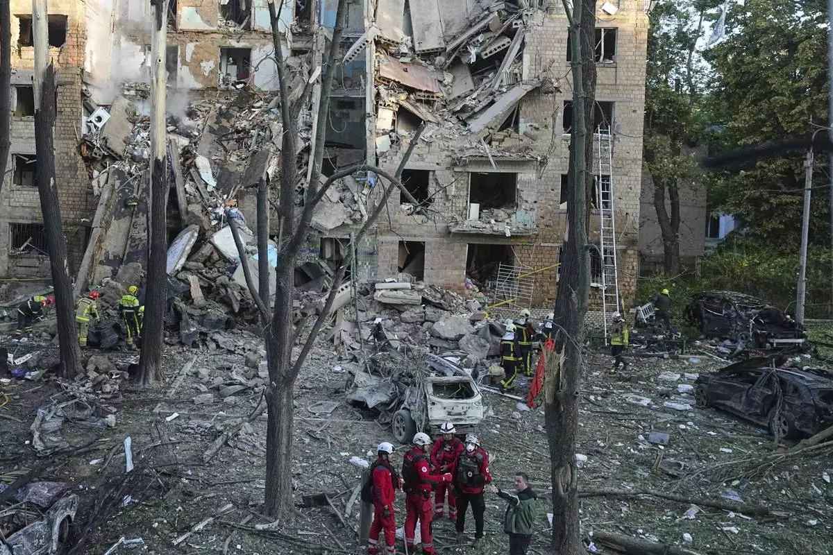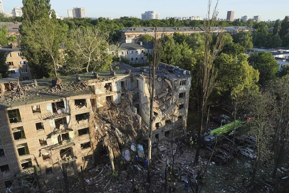 KYIV, Ukraine (AP) — Russian drones and missiles killed at least 14 civilians and injured several dozen others in Ukraine in overnight attacks, local officials said Monday, with nine deaths reported in the capital, Kyiv, where an apartment building partially collapsed.