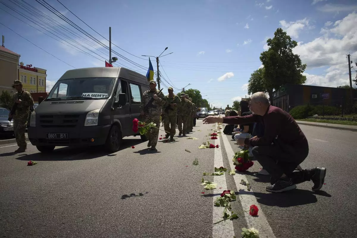 Villagers throw flowers on the road during the funeral procession of Maksym Baluyev, a soldier who was killed in battle with the Russian troops, in the village of Novi Petrivtsi close to Kyiv, Ukraine, Monday, June 23, 2025. (AP Photo/Efrem Lukatsky)