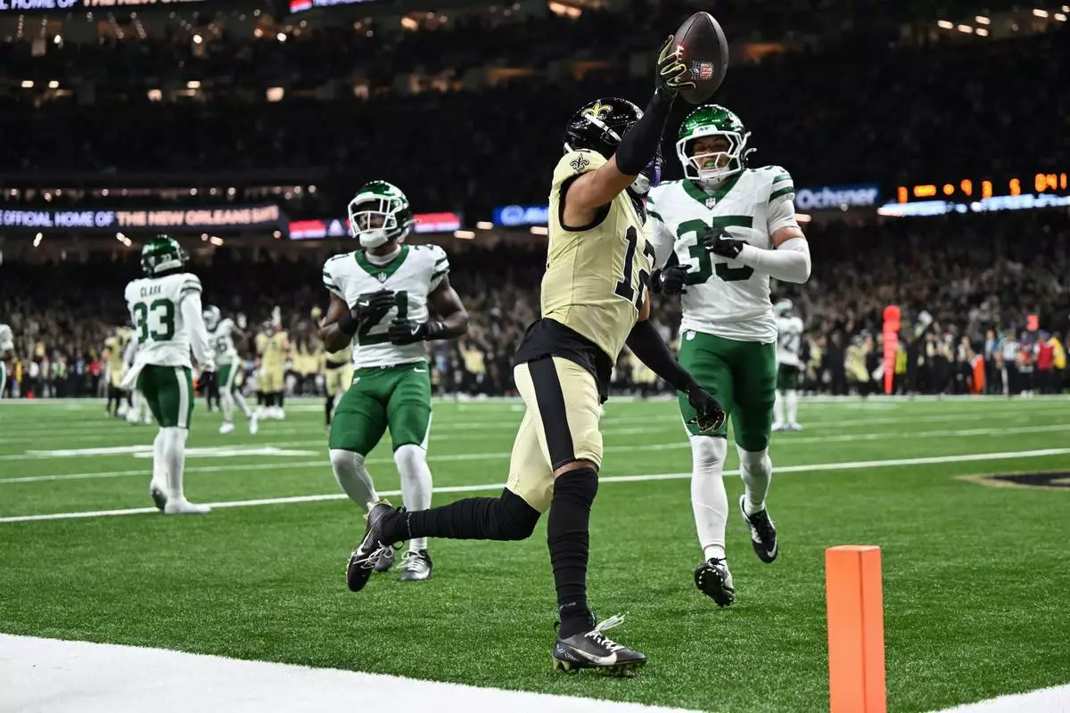 Receiver Chris Olave continued to build his case as one of the NFL's leading comeback players. He missed nine games last season, mostly because of a major concussion that cast uncertainty over his career. His 10 catches for 148 yards and two TDs against the Jets increased his season totals to 92 catches for 1,044 yards and eight TDs — all career highs.