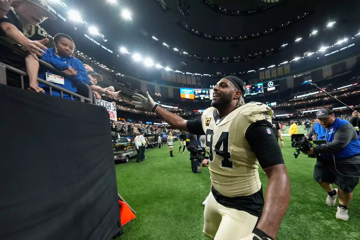 New Orleans Saints defensive end Cameron Jordan greets fans after an NFL football game against the New York Jets, Sunday, Dec. 21, 2025, in New Orleans. (AP Photo/Gerald Herbert)
