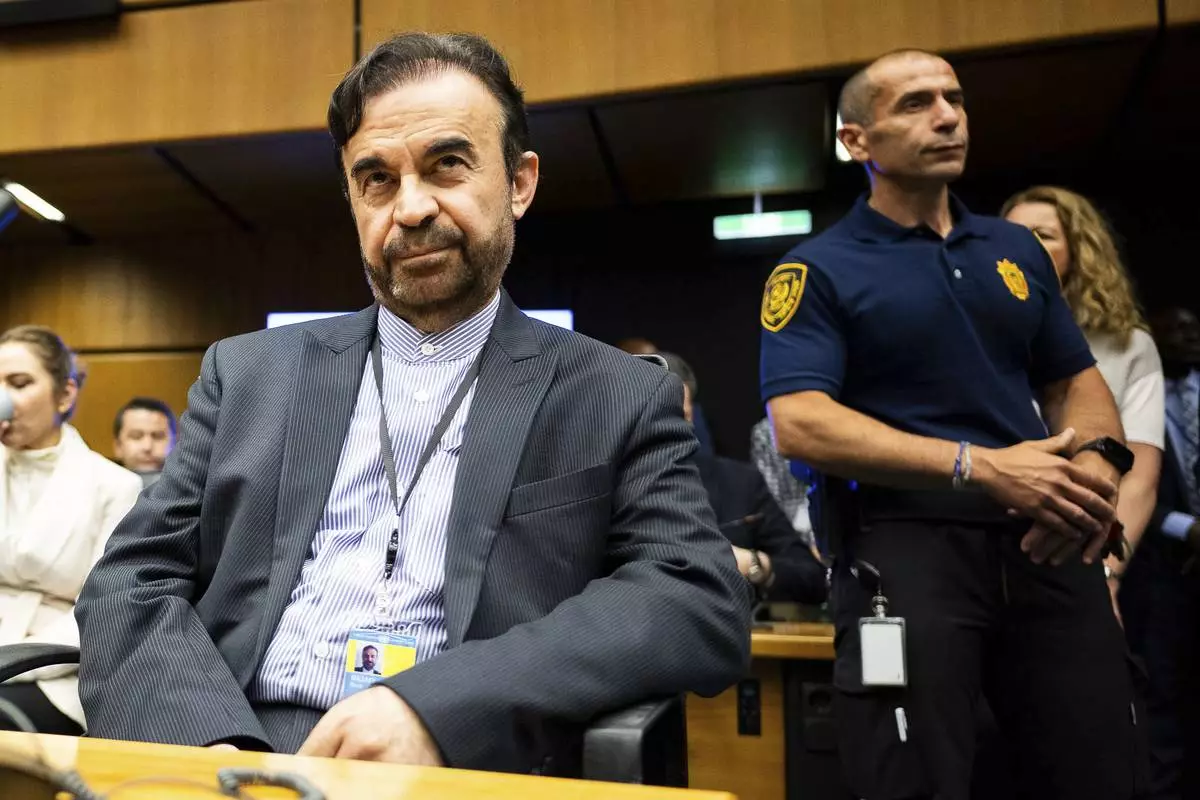 Iran's Ambassador to the International Atomic Energy Agency, IAEA, Reza Najafi, left, attends an IAEA Board of Governors meeting in Vienna, Austria, Monday, June 23, 2025. (AP Photo/Michael Gruber)