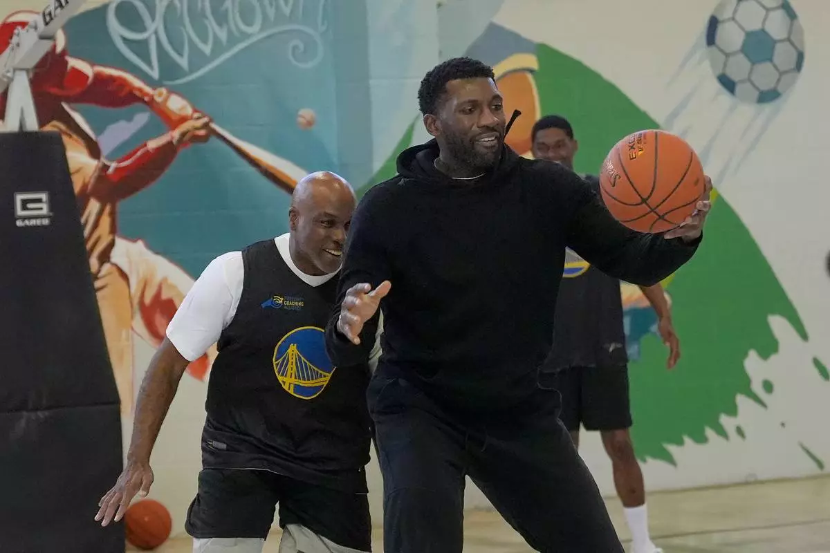 Barry Monroe, left, guards former NBA basketball player Festus Ezeli as Twinning Project cohort 2 participants perform drills during the project's collaboration with the Golden State Warriors and the California Department of Corrections and Rehabilitation at Solano State Prison in Vacaville, Calif., Tuesday, Feb. 11, 2025. (AP Photo/Jeff Chiu)