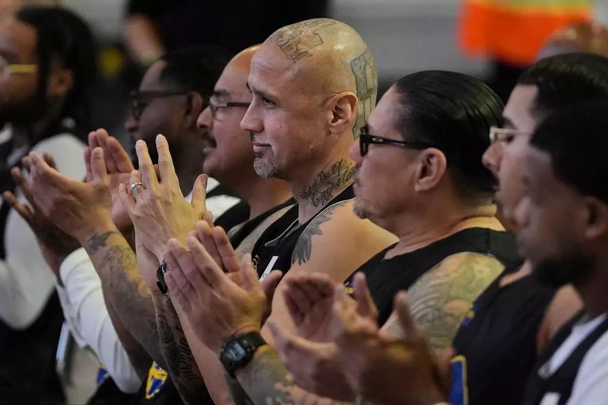 Michael San Agustin, middle, and other Twinning Project cohort 2 participants applaud speakers during the project's collaboration with the NBA's Golden State Warriors and the California Department of Corrections and Rehabilitation at Solano State Prison in Vacaville, Calif., Tuesday, Feb. 11, 2025. (AP Photo/Jeff Chiu)