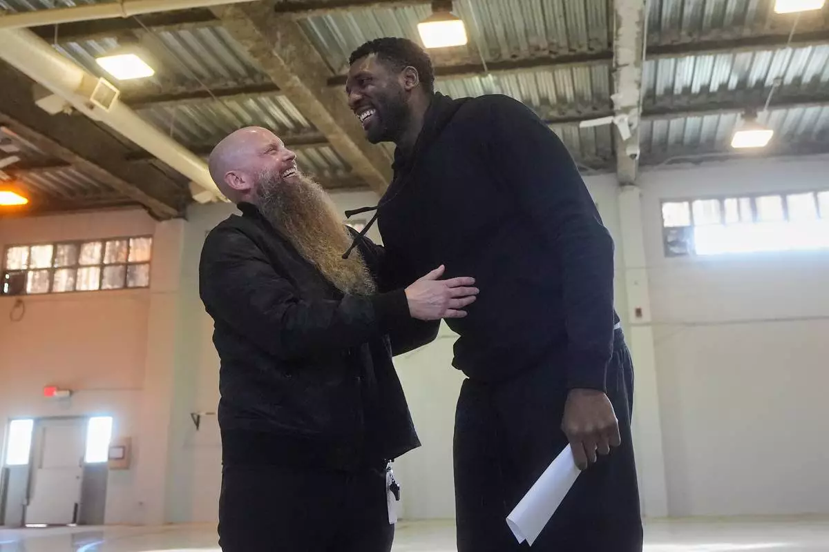 Mental skills coach Graham Betchart, left, laughs with former NBA basketball player Festus Ezeli before Twinning Project cohort 2 participants graduated during the project's collaboration with the Golden State Warriors and the California Department of Corrections and Rehabilitation at Solano State Prison in Vacaville, Calif., Tuesday, Feb. 11, 2025. (AP Photo/Jeff Chiu)