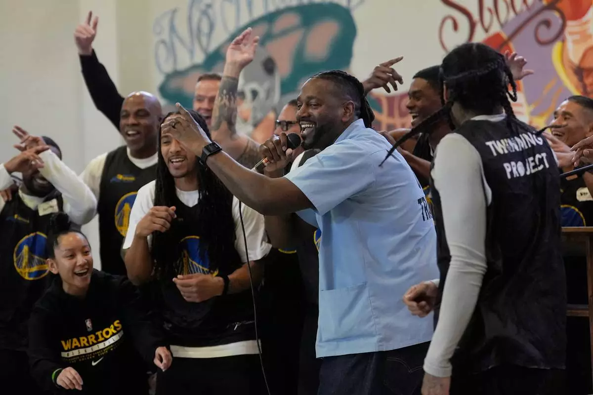 Ray Woodfork, a graduate of Twinning Project's collaboration with the NBA's Golden State Warriors and the California Department of Corrections and Rehabilitation's cohort 1, middle, performs a rap song in front of cohort 2 participants and Warriors Basketball Academy members at Solano State Prison in Vacaville, Calif., Tuesday, Feb. 11, 2025. (AP Photo/Jeff Chiu)