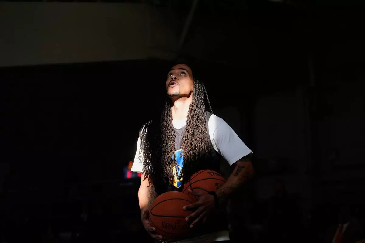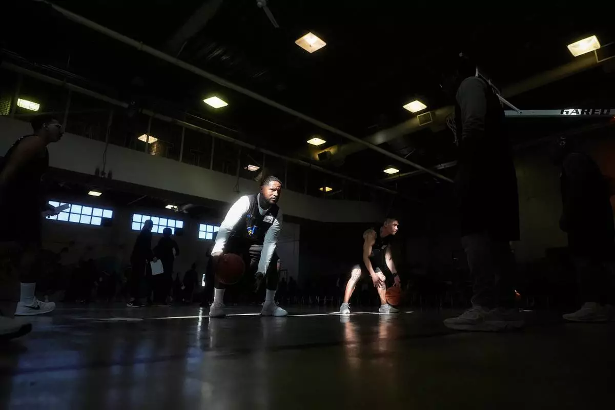 Jonah Dillingham performs basketball drills with other Twinning Project cohort 2 participants during the project's collaboration with the NBA's Golden State Warriors and the California Department of Corrections and Rehabilitation at Solano State Prison in Vacaville, Calif., Tuesday, Feb. 11, 2025. (AP Photo/Jeff Chiu)