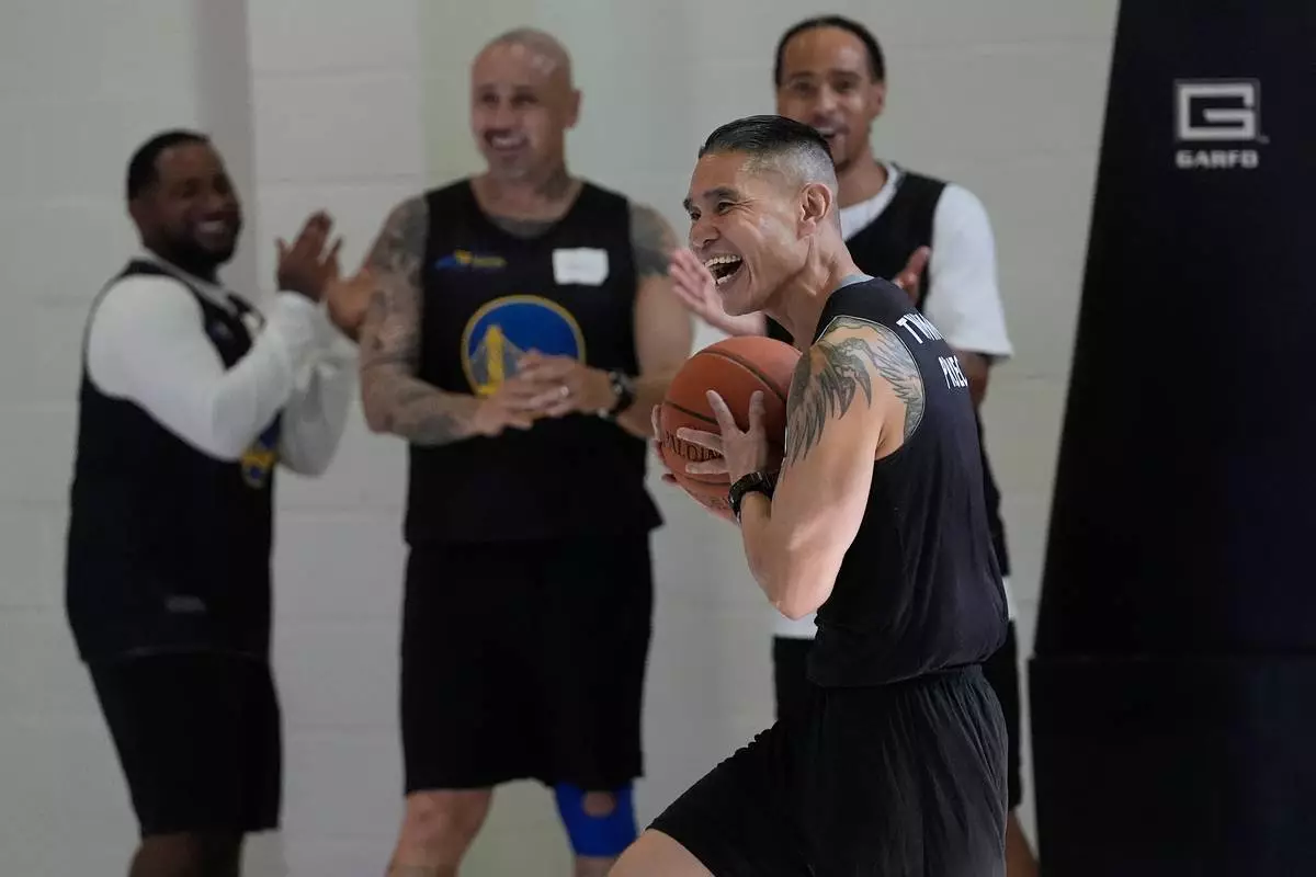 Daniel Lopez performs a basketball drill with other Twinning Project cohort 2 participants during the project's collaboration with the NBA's Golden State Warriors and the California Department of Corrections and Rehabilitation at Solano State Prison in Vacaville, Calif., Tuesday, Feb. 11, 2025. (AP Photo/Jeff Chiu)