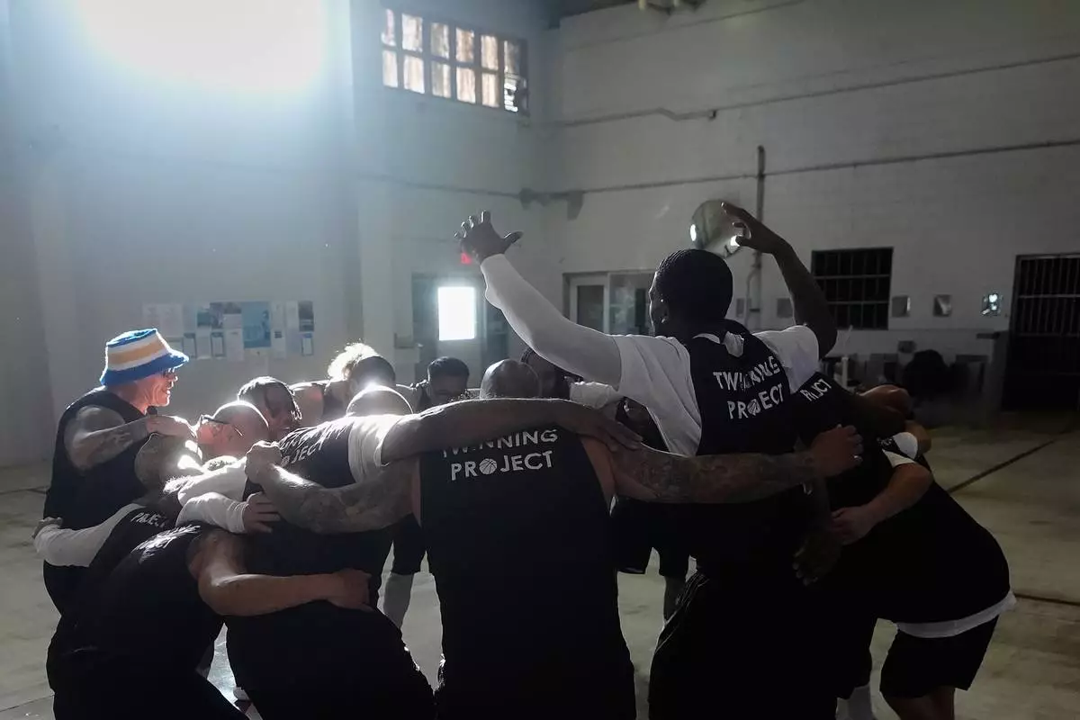 Twinning Project cohort 2 participants gather before performing drills during the project's collaboration with the NBA's Golden State Warriors and the California Department of Corrections and Rehabilitation at Solano State Prison in Vacaville, Calif., Tuesday, Feb. 11, 2025. (AP Photo/Jeff Chiu)