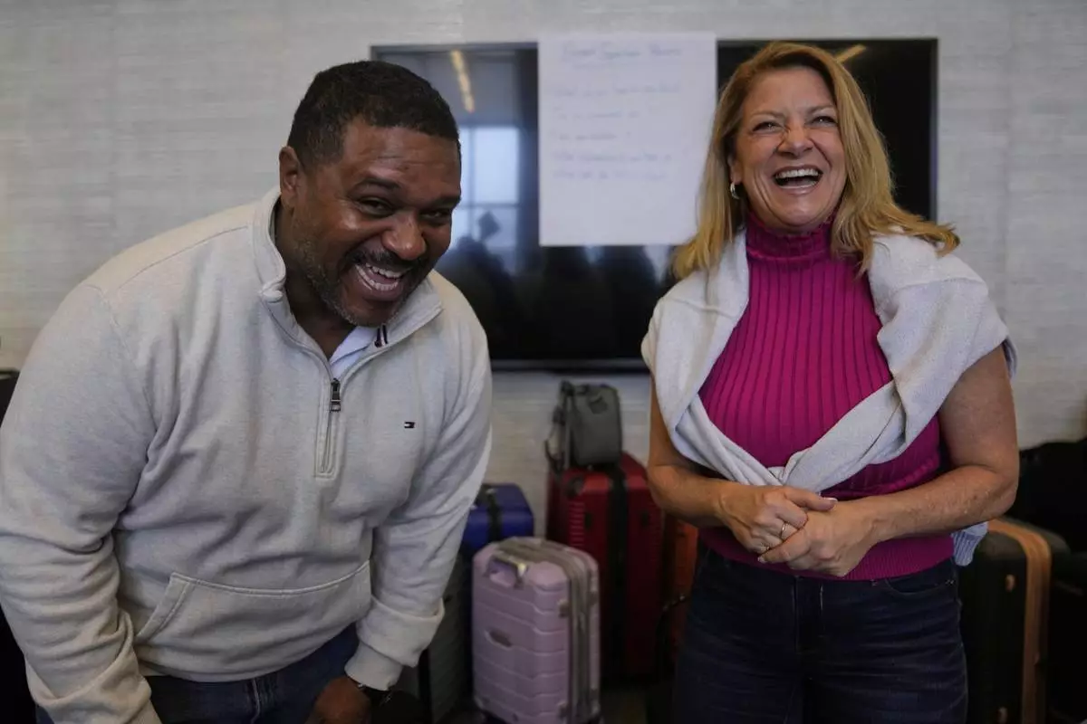 Rocky Mount Police Department Capt. James Staten, left, and Luann Pannell, director of instructional design and academic innovation with the Policing Leadership Academy, participate in an improvisational exercise lead by The Second City instructors during a Univeristy of Chicago Crime Lab class that is part of the Leadership program, on April 11, 2025, in Chicago. (AP Photo/Erin Hooley)