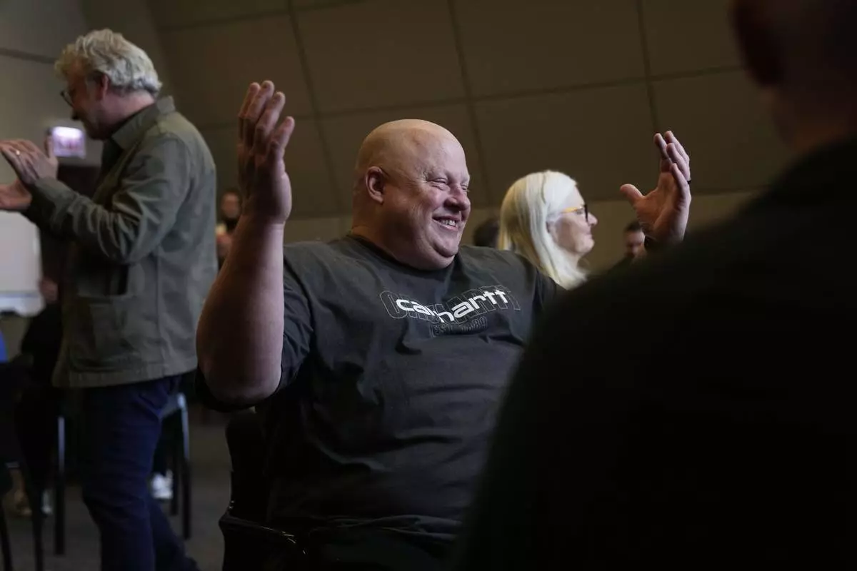 San Jose Police Department Capt. Stephen Donohue participates in an improvisational exercise lead by The Second City instructors during a University of Chicago Crime Lab class that is part of the Policing Leadership Academy program, on April 11, 2025, in Chicago. (AP Photo/Erin Hooley)