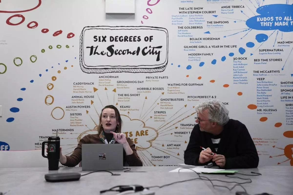 Strategic Client Partner Tree Branch, left, and Vice President, Creative Strategy, Innovation and Business Development Kelly Leonard talk during a planning meeting at The Second City improvisational comedy space, on March 26, 2025, in Chicago. (AP Photo/Erin Hooley)