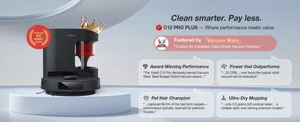 "The Yeedi C12 Pro decisively earned Vacuum Wars' Best Budget Robot Vacuum award for mid-2025. It clearly demonstrates that top-tier and highly useful cleaning technology can be both affordable and effective." – Vacuum Wars