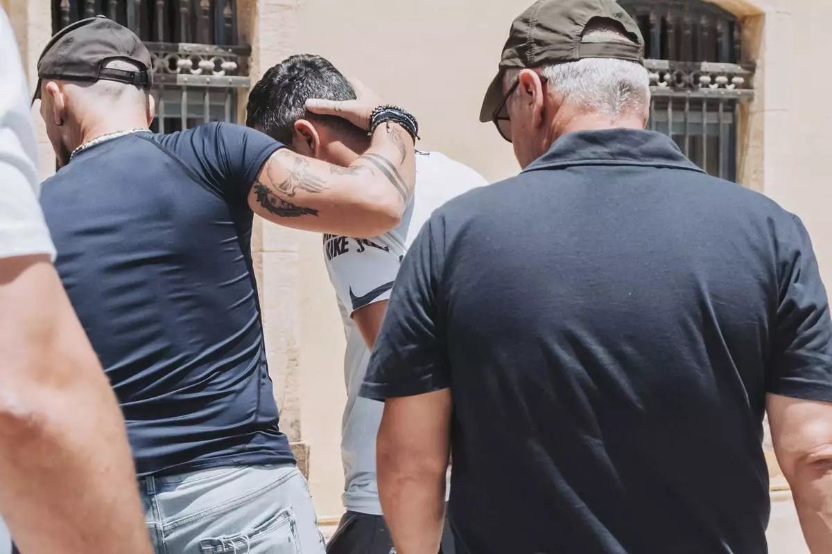 A man from Azerbaijan, center, who was carrying a Polish passport and arrested on suspicion of espionage, leaves the court escorted by plainclothes police officers in Chania, on the southern island of Crete, Greece, Monday, June 23, 2025. (AP Photo/Giannis Angelakis)