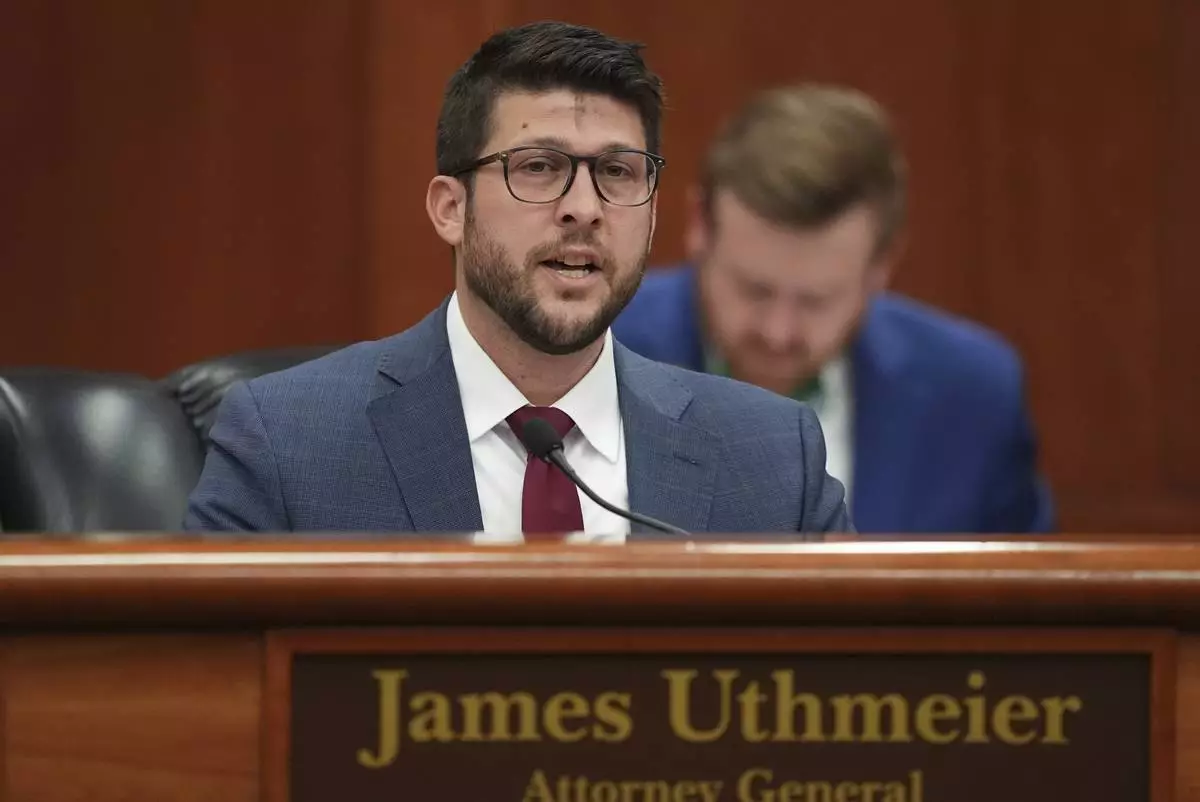 FILE - Florida Attorney General James Uthmeier speaks during a meeting between Gov. Ron DeSantis and the state cabinet at the Florida capitol in Tallahassee, Fla., Wednesday, March 5, 2025. (AP Photo/Rebecca Blackwell, file)
