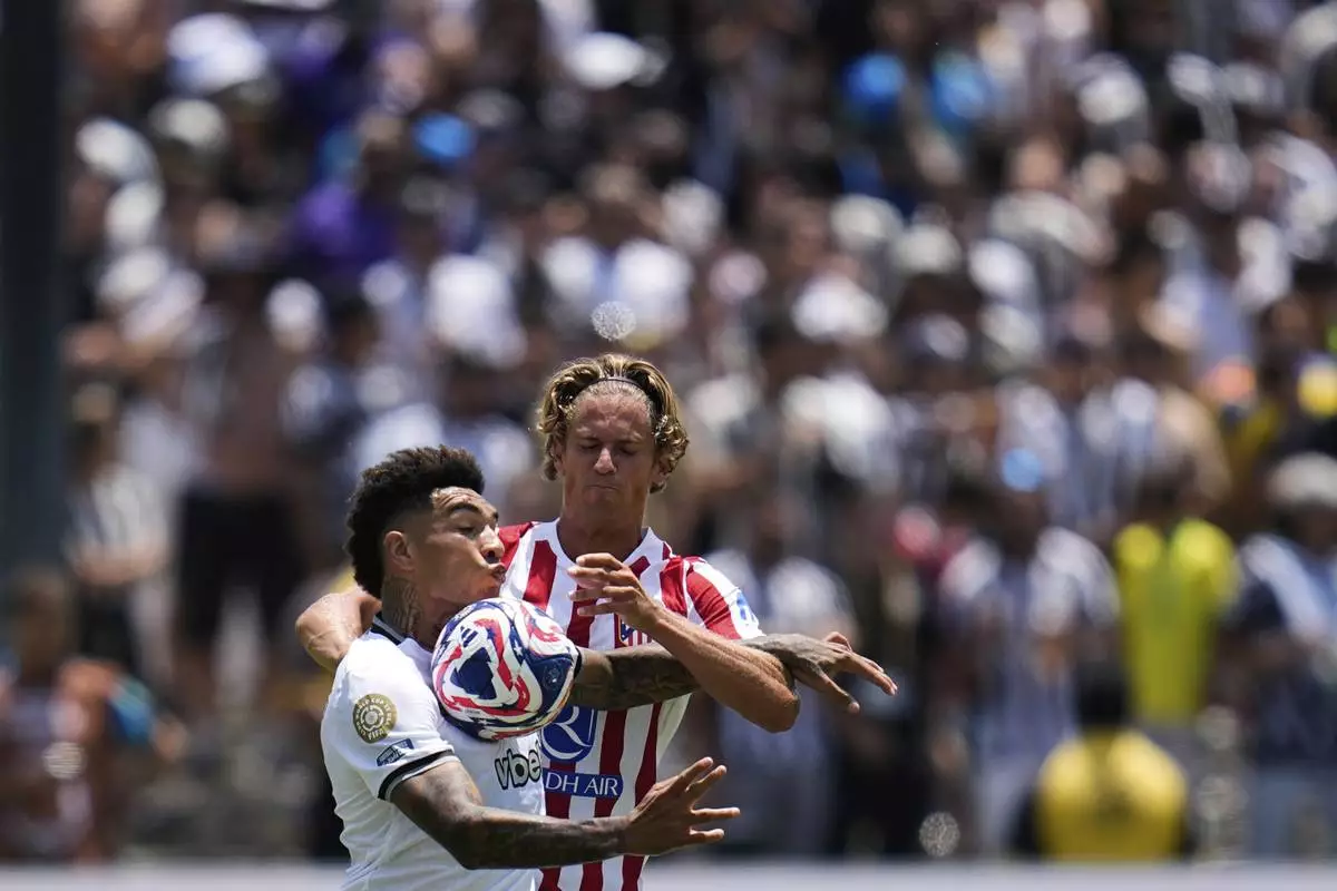 Atletico Madrid's Alexander Sorloth, back, heads a ball challenged by Botafogo's Jair Cunha during the Club World Cup Group B soccer match between Atletico Madrid and Botafogo in Pasadena, Calif., Monday, June 23, 2025. (AP Photo/Jae Hong)