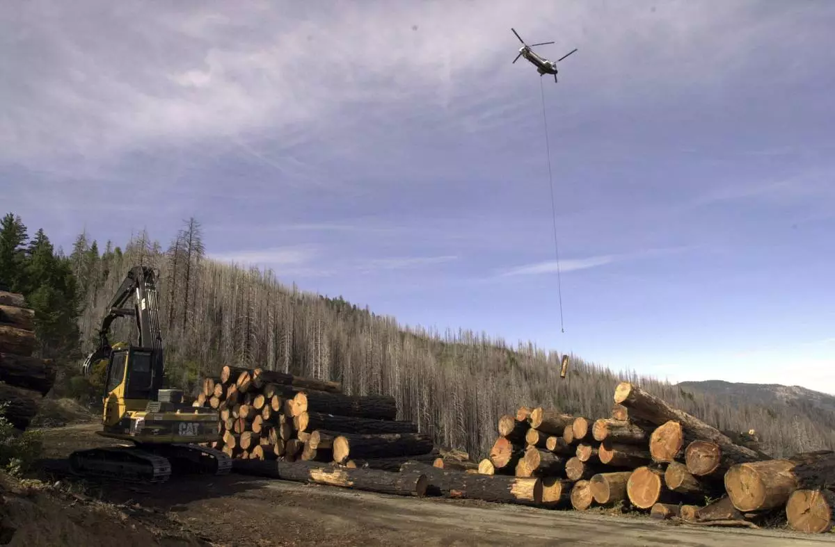 FILE - A helicopter ferries a log to the landing Wednesday, Sept. 20, 2006, on the Mike's Gulch timber sale in the South Kalmiopsis Roadless Area of the Rogue River-Siskiyou National Forest near Selma, Ore. (AP Photo/Jeff Barnard,File)
