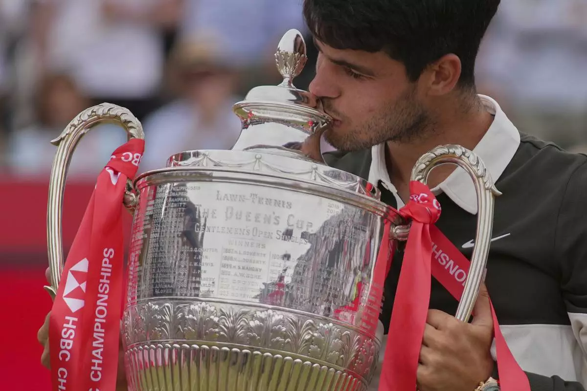 Carlos Alcaraz of Spain kisses the winners trophy as he poses for photographs after defeating Jiri Lehecka of the Czech Republic, in the men's singles final of the Queens Club tennis championships in London, Sunday, June 22, 2025. (AP Photo/Joanna Chan)