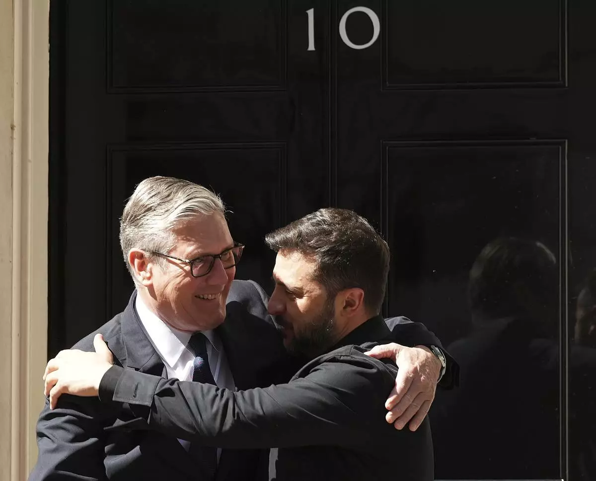 Britain's Prime Minister Keir Starmer welcomes Ukraine's President Volodymyr Zelenskyy to Downing Street in London, Monday, June 23, 2025. (AP Photo/Frank Augstein)
