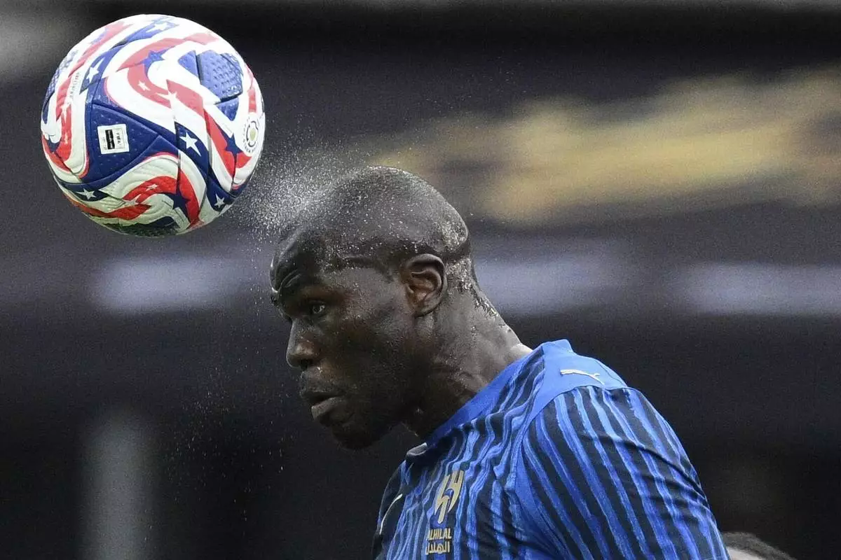 Al-Hilal's Kalidou Koulibaly heads the ball during the Club World Cup Group H soccer match between Salzburg and Al Hilal in Washington, Sunday, June 22, 2025. (AP Photo/Nick Wass)