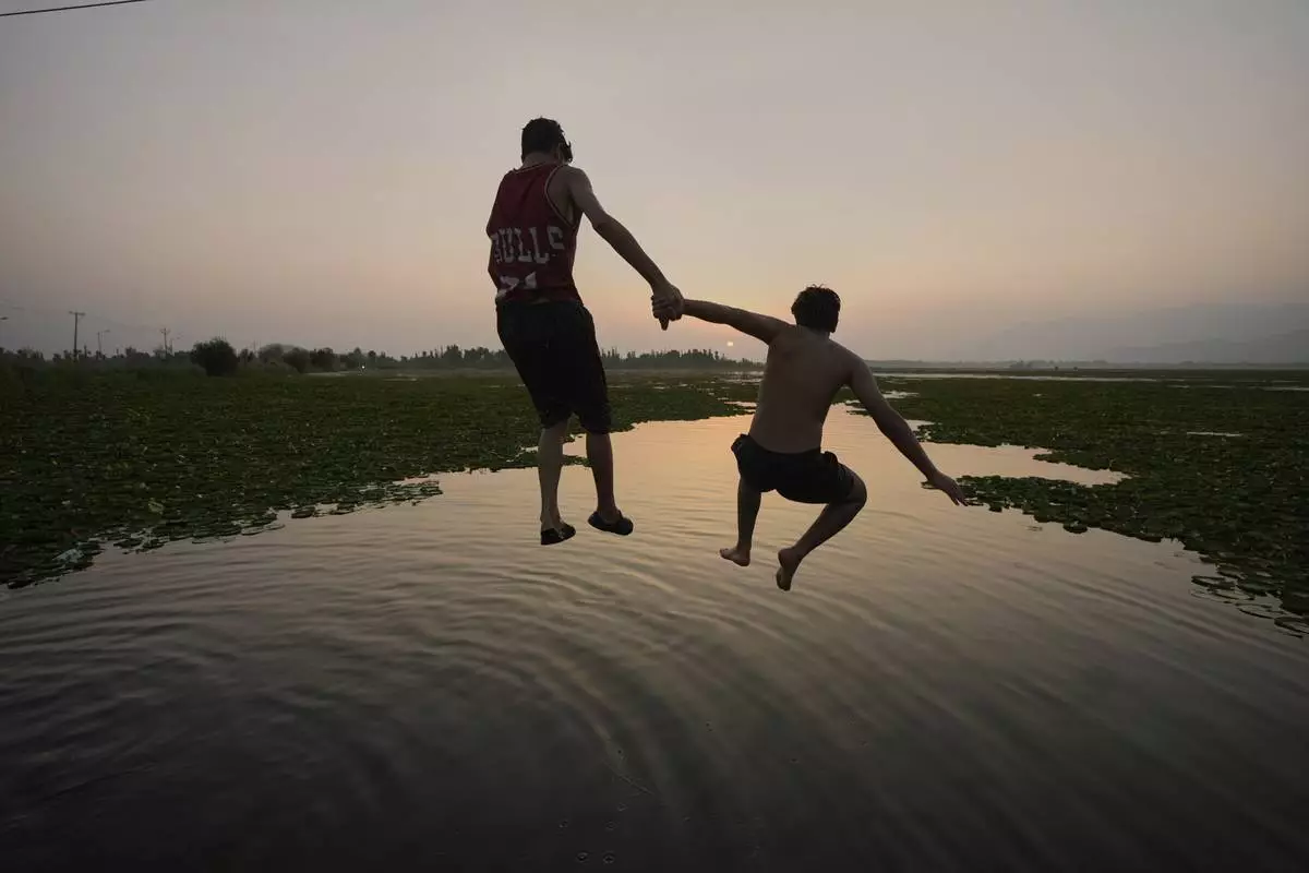 Boys jump together as they cool off on a hot summer day at Dal Lake in Srinagar, Indian-controlled Kashmir, Monday, June 23, 2025. (AP Photo/Mukhtar Khan)