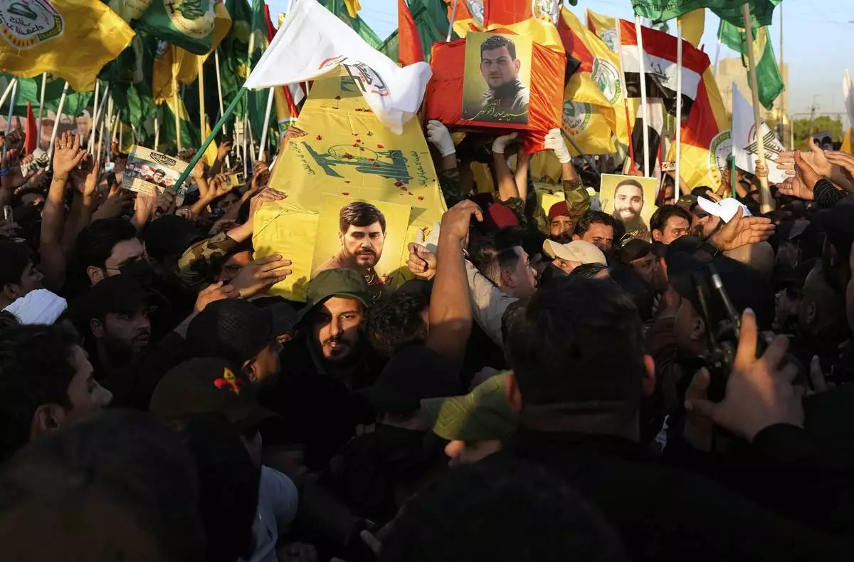 Members from the Popular Mobilization Forces carrying the coffin of Hussein Khalil, a former aide to the late Hezbollah Secretary-General Hassan Nasrallah who killed with Iraqi commander Haider al-Moussawi from Kataeb Sayyed Al-Shuhada by an Israeli airstrike inside Iran, in Baghdad, Iraq, Sunday, June 22, 2025. (AP Photo/Hadi Mizban)