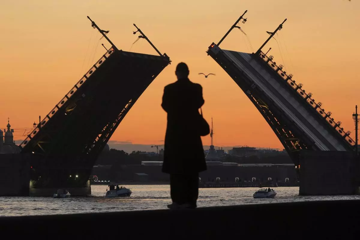 A man looks at the rising Dvortsovy (Palace) drawbridge on the Neva River in St. Petersburg, Russia, early Monday, June 23, 2025. (AP Photo/Dmitri Lovetsky)