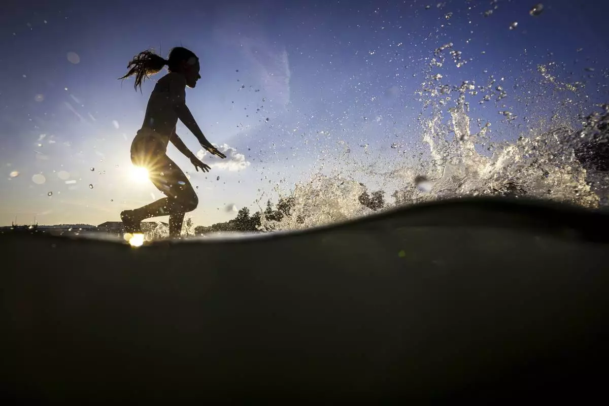 A girl jumps into the river Rhine to cool off during high temperatures, near Kaiserstuhl, Switzerland, Sunday, June 22, 2025. (Michael Buholzer/Keystone via AP)