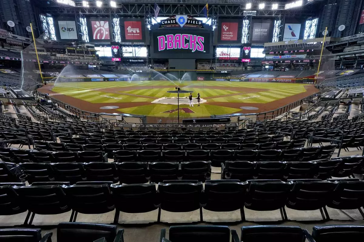 FILE - Chase Field sits empty after the Colorado Rockies decided not to play their baseball game against the Arizona Diamondbacks, on Aug. 27, 2020, in Phoenix. (AP Photo/Matt York, File)