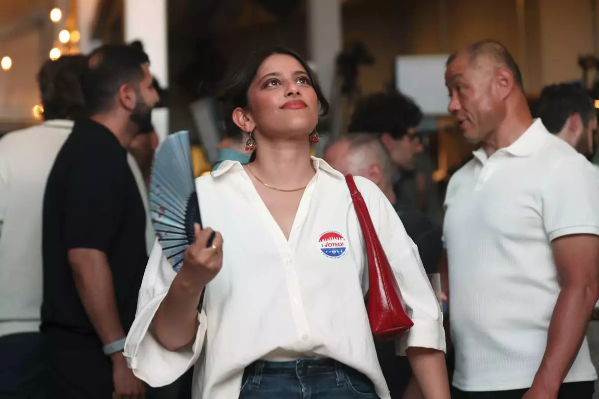 Supporters of Democratic mayoral candidate Zohran Mamdani fan themselves to keep cool as they watch results come in at his primary election party, Tuesday, June 24, 2025, in New York. (AP Photo/Heather Khalifa)