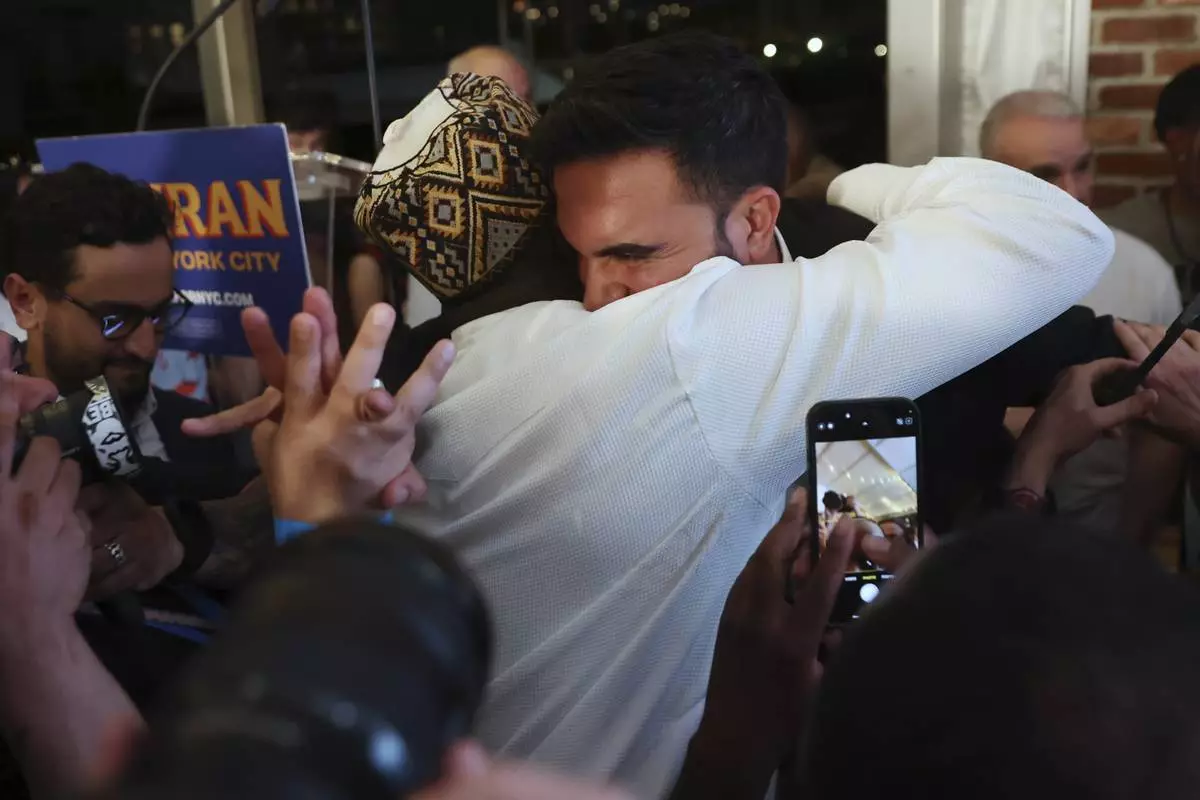 Democratic mayoral candidate Zohran Mamdani hugs supporters after speaking at his primary election party, Wednesday, June 25, 2025, in New York. (AP Photo/Heather Khalifa)