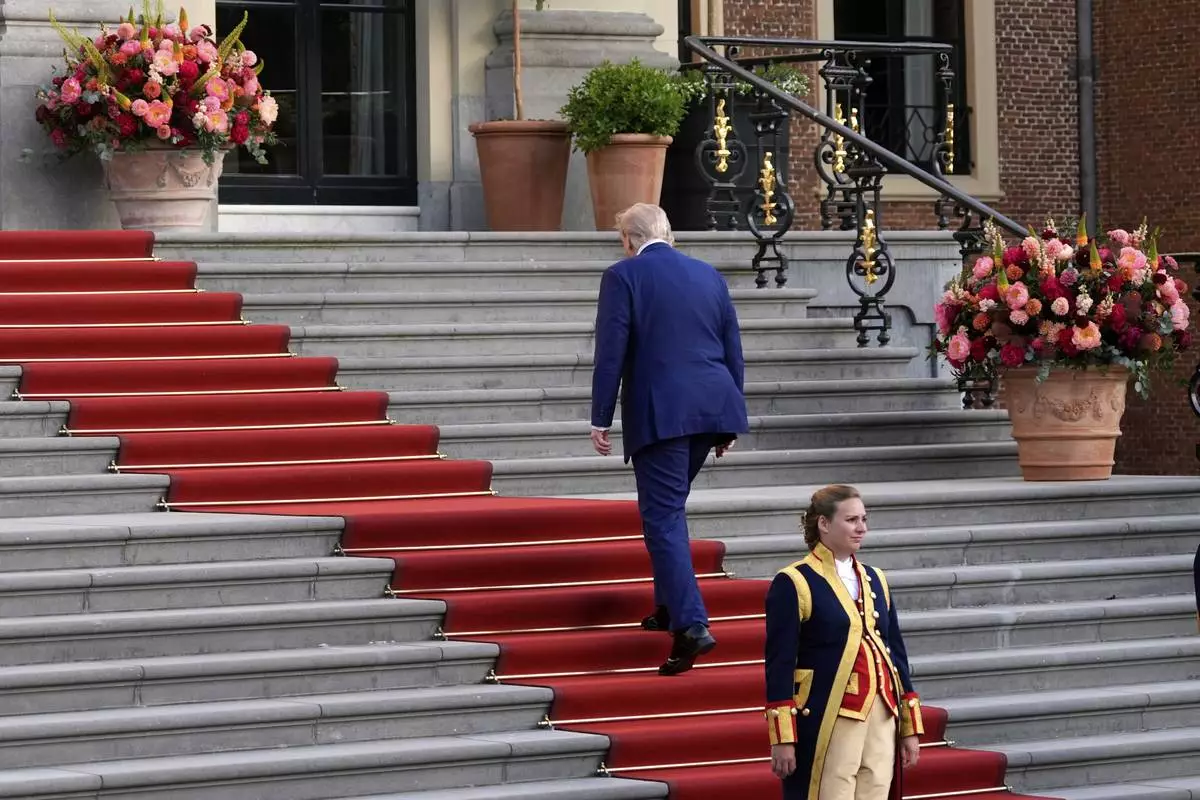 President Donald Trump climbs the stairs to the Paleis Huis ten Bosch ahead of the NATO summit in The Hague, Netherlands, Tuesday, June 24, 2025. (AP Photo/Alex Brandon)