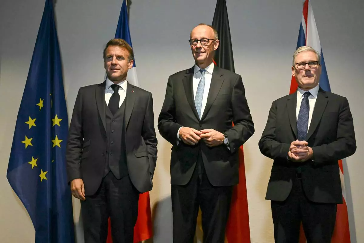 From left, France's President Emmanuel Macron, Germany's Chancellor Friedrich Merz and Britain's Prime Minister Keir Starmer pose as they meet on the sidelines of the two-day NATO's Heads of State and Government summit in The Hague, Tuesday, June 24, 2025. (Ben Stansall/Pool Photo via AP)