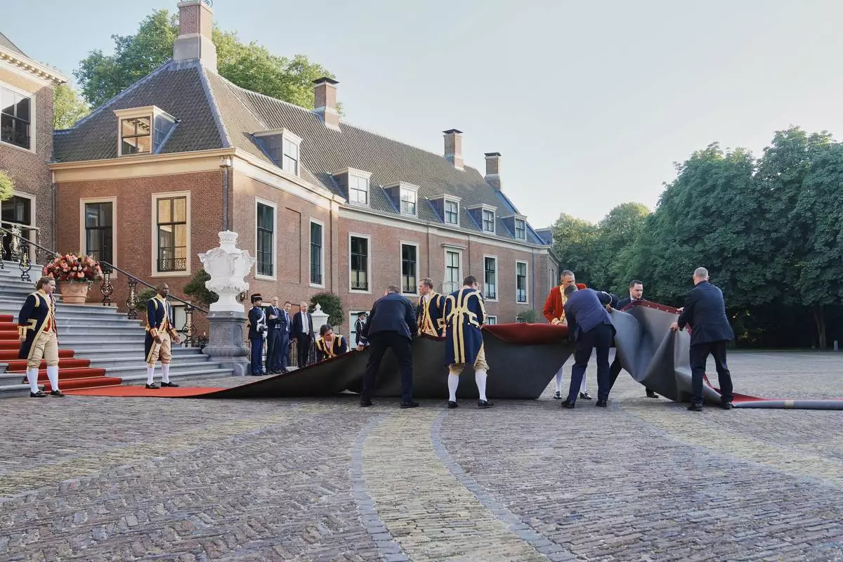 Staff members handle the red carpet that was blown by a gust of wind ahead of President Donald Trump's arrival for a formal dinner at the Paleis Huis ten Bosch ahead of the NATO summit in The Hague, Netherlands, Tuesday, June 24, 2025. (AP Photo/Markus Schreiber)