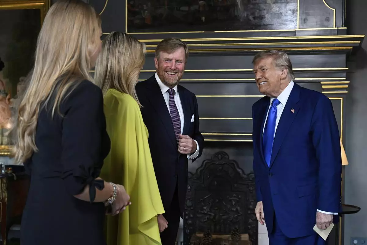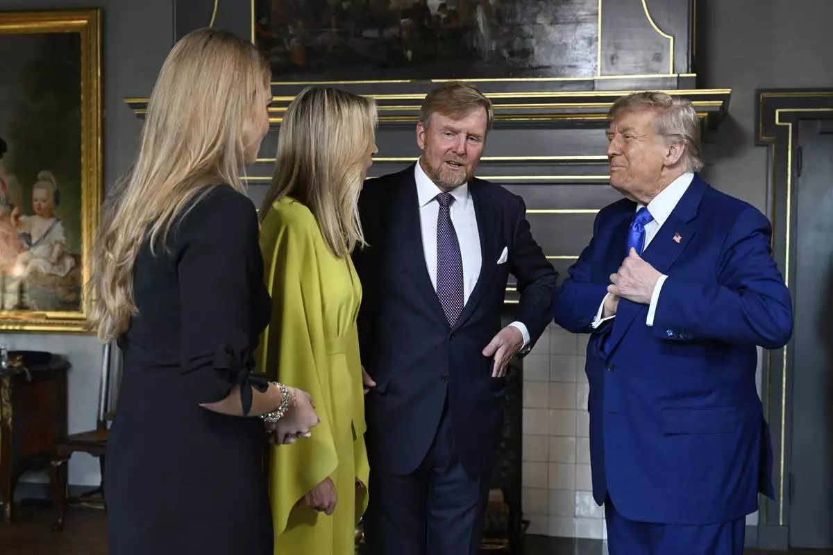 President Donald Trump, right, is welcomed by Netherland's King Willem Alexander, Netherland's Queen Maxima and Netherland's Crown Princess Amalia as he arrives for a formal dinner at the Paleis Huis ten Bosch ahead of the NATO summit in The Hague, Netherlands, Tuesday, June 24, 2025. (Misha Schoemakers, Pool Photo via AP)