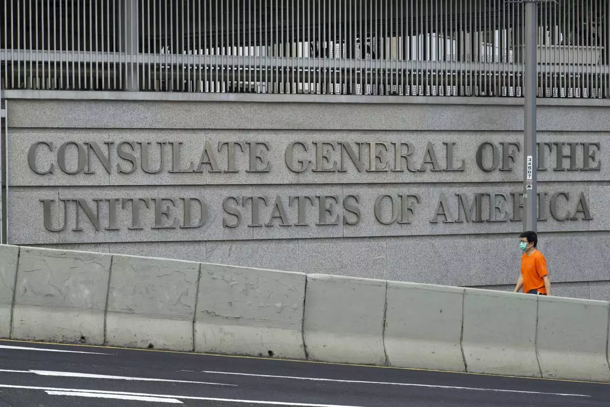 FILE - A man walks past U.S. Consulate in Hong Kong, March 15, 2021. (AP Photo/Vincent Yu, File)