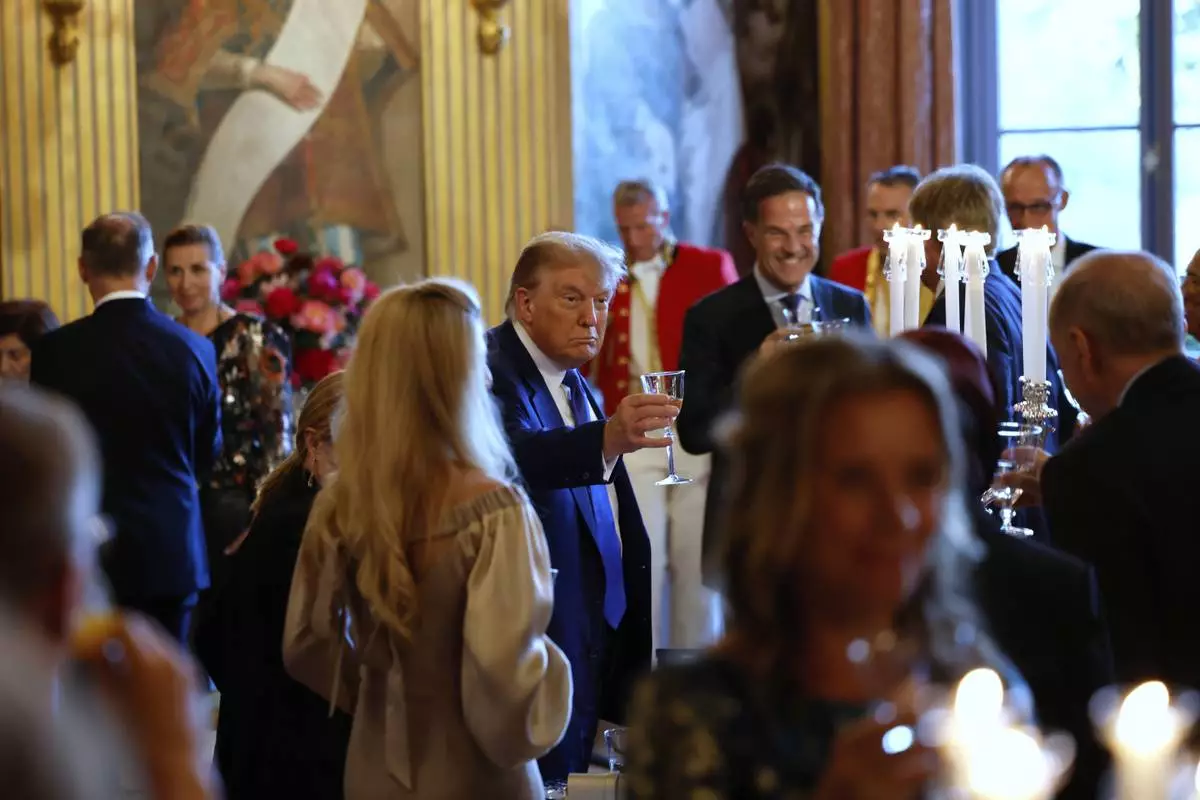 President Donald Trump, center, attends a dinner of NATO heads of state and government at the Paleis Huis ten Bosch ahead of the NATO summit in The Hague, Netherlands, Tuesday, June 24, 2025. (Remko de Waal, Pool Photo via AP)
