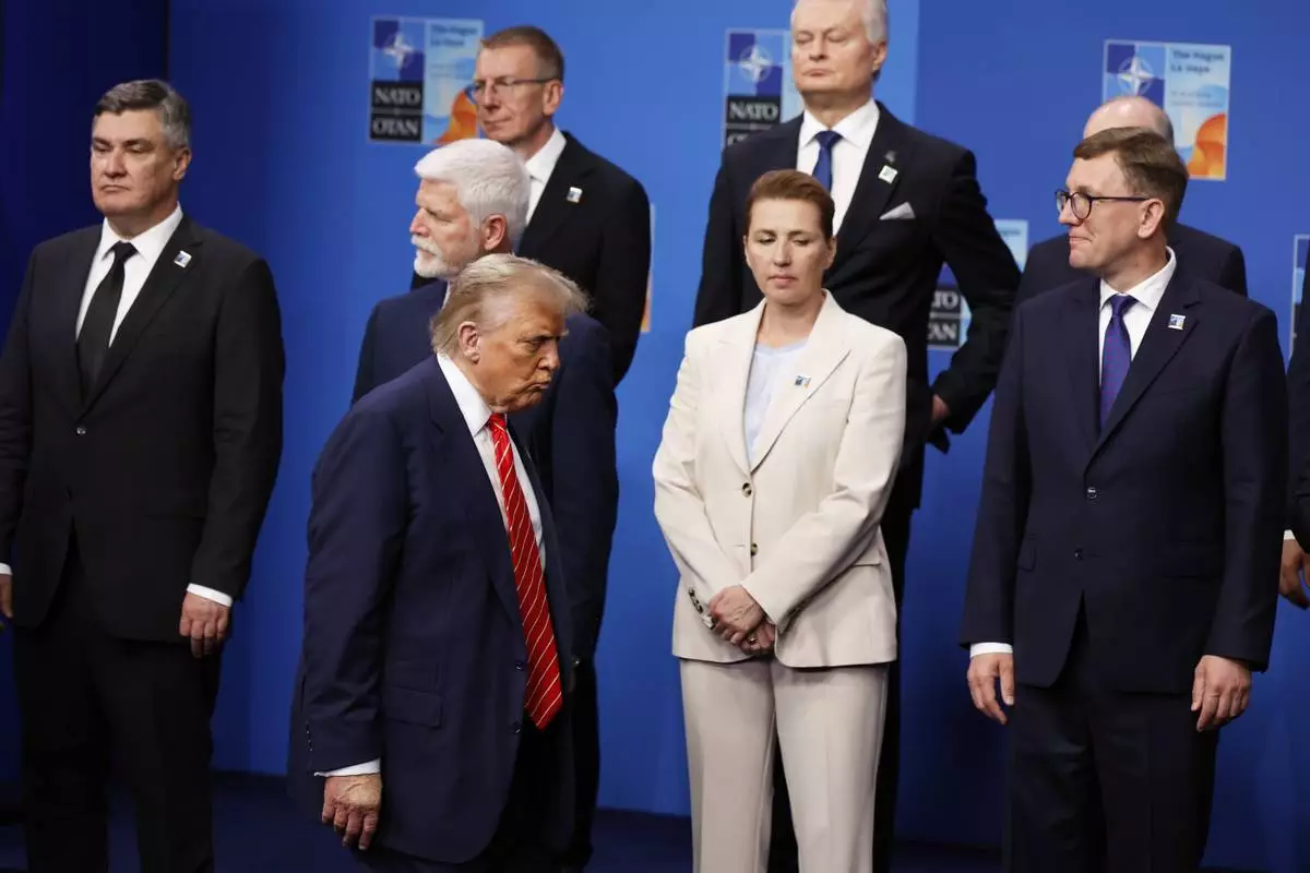 President Donald Trump, center left, walks by Denmark's Prime Minister Mette Frederiksen, center front, prior to a group photo of NATO heads of state and government at the NATO summit in The Hague, Netherlands, Wednesday, June 25, 2025. (AP Photo/Geert Vanden Wijngaert)