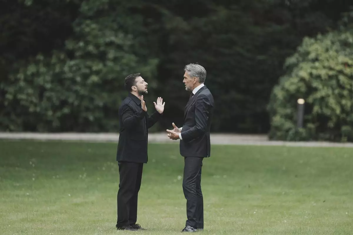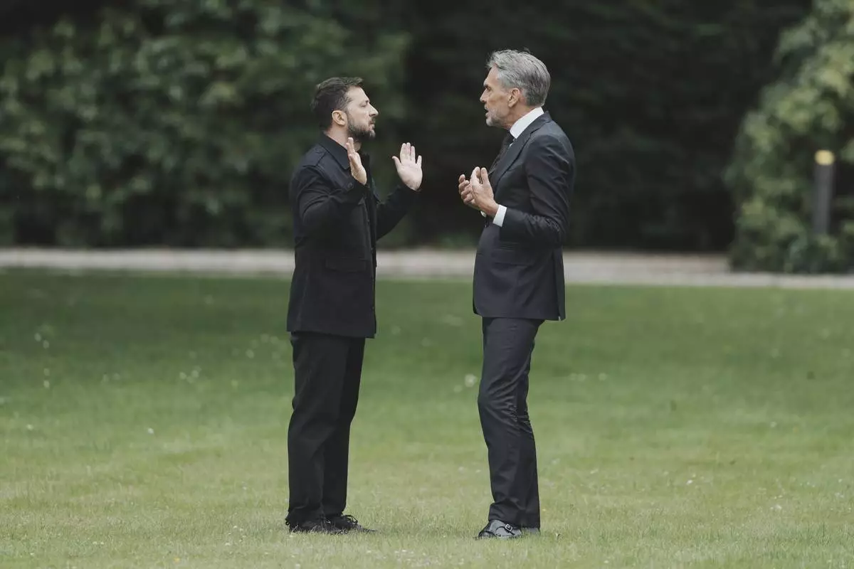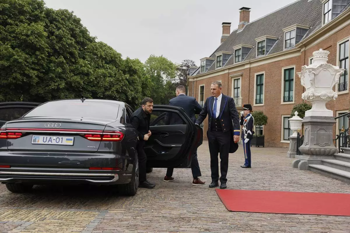 Ukraine's President Volodymyr Zelenskyy, left, arrives at the Paleis Huis ten Bosch ahead of a dinner on the sidelines of the NATO summit in The Hague, Netherlands, Tuesday, June 24, 2025. (Remko de Waal, Pool Photo via AP)