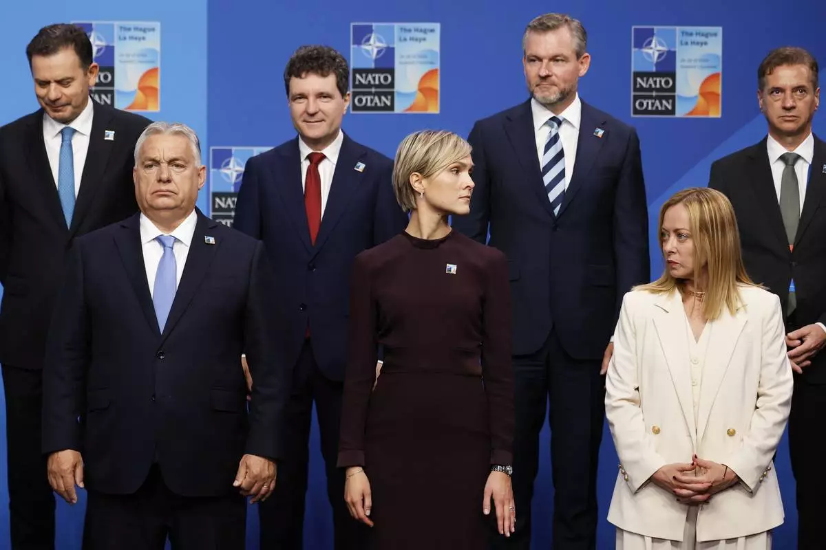 Front row left to right, Hungary's Prime Minister Viktor Orban, Iceland's Prime Minister Kristrun Frostadottir and Italy's Prime Minister Giorgia Meloni pose during a group photo of NATO heads of state and government at the NATO summit in The Hague, Netherlands, Wednesday, June 25, 2025. (AP Photo/Geert Vanden Wijngaert)